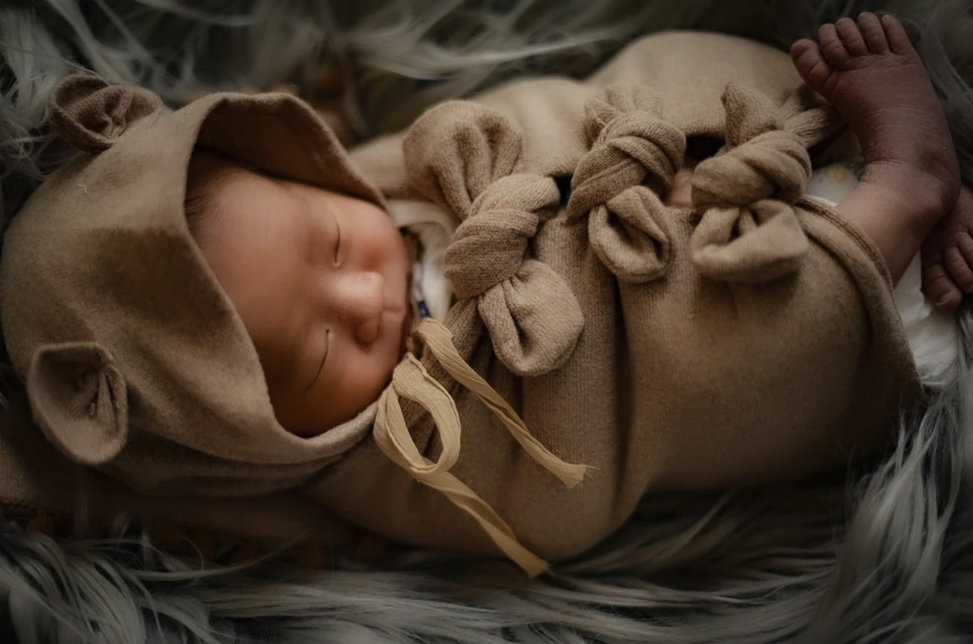 生まれたばかりの赤ちゃんに、かわいい衣装を着せたり小道具を使ったりして撮影したものです。