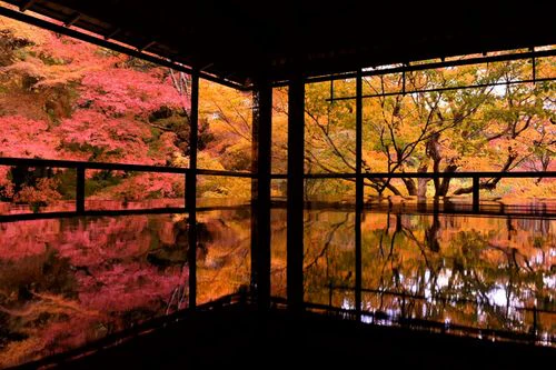 有名な京都・瑠璃光院の紅葉は、机に反射する絶景がイチオシです。