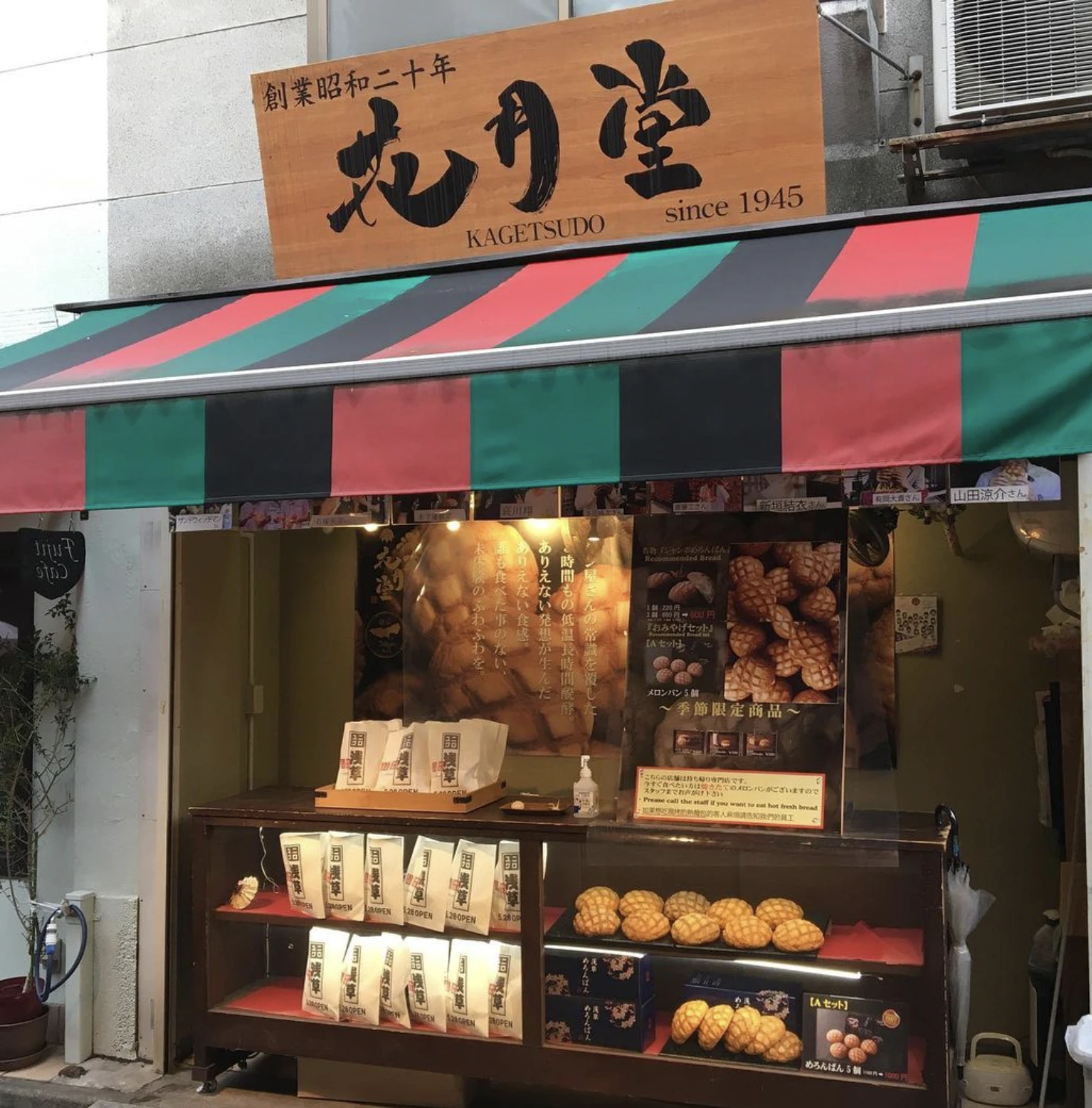 1945(昭和20)年創業の老舗和菓子屋「花月堂」。1日3,000個売り上げる人気商品「ジャンボめろんぱん」をはじめとする和菓子が購入できます。お店の壁一面に飾られた風車を背景に、浴衣や着物を着て撮影するのもおすすめです。