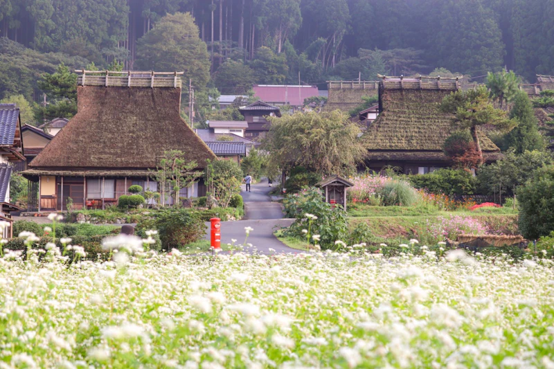 かやぶき屋根と満開の蕎麦の花、後ろに迫る森の木々。