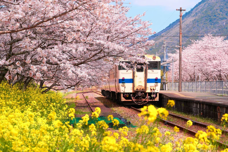 満開の桜と菜の花、人のいない駅のホームに、レトロな車体。
