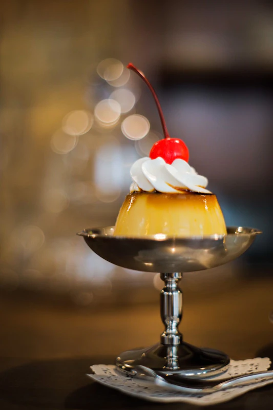 ツヤっとハイライトが入ることで、プリンや生クリームが輝いて見えますね。