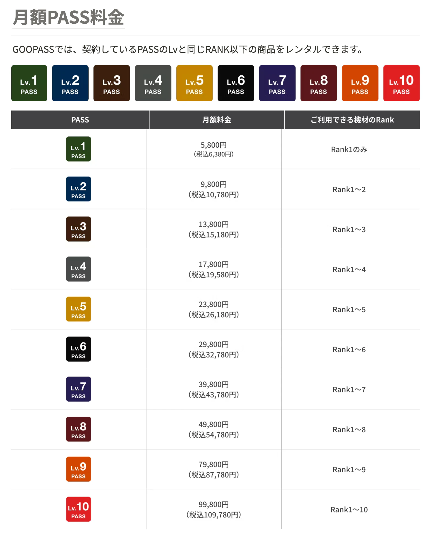 PASSのレベルが高くなるほど高価な月額料金も高くなりますが、借りられる製品のラインナップは増えていきます。
