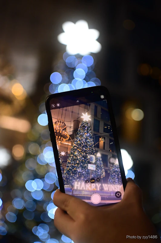 背景にクリスマスツリーの光がきれいな玉ボケになって幻想的ですね。
