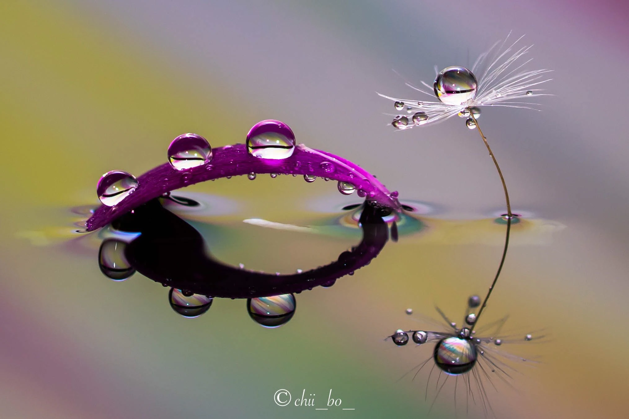 花びらや綿毛についた水滴が、ガラス玉と同じ効果となっています。