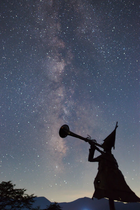 手前の銅像が宇宙に向かってラッパを吹き、その音を天の川に見立てて撮った作品です。