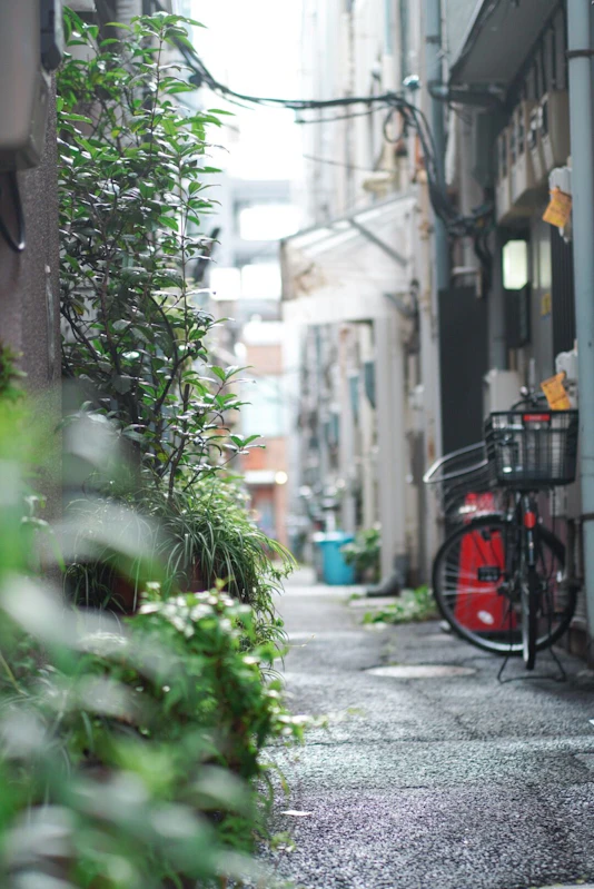 地元の人しか通らないであろう狭い路地に、生活感あふれるポリバケツや自転車。