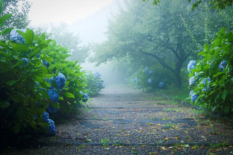 少し先が霞むほどの霧の中、咲き誇るあじさいが見事です。