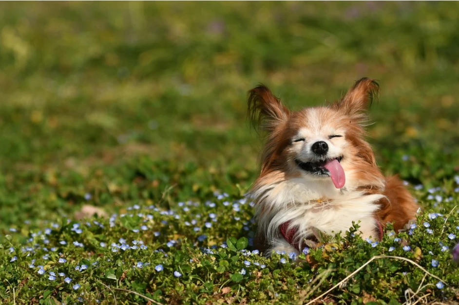 天気に恵まれた暖かい日に外を散歩しているときの写真だそう。ワンちゃんが笑っているかのように目を細めている様子が印象的ですね。周りの青い小さな花も被写体をよく引き立てています。