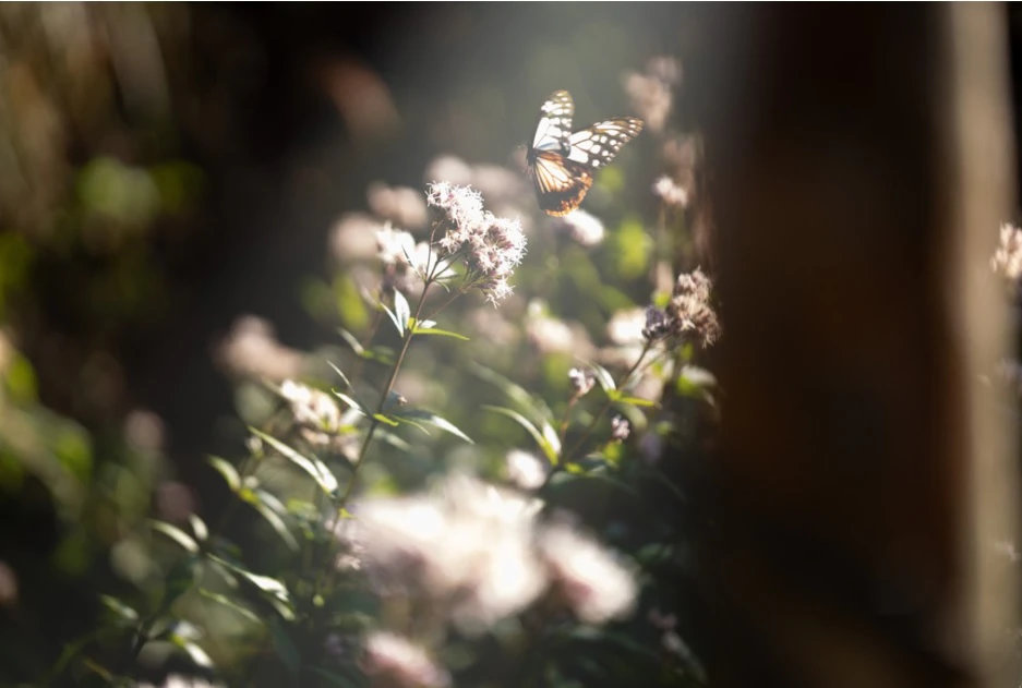 一筋の光が指している位置にアサギマダラがひらひらと寄ってきたシーンを撮影。きっとこの瞬間は忍耐と偶然が重なった奇跡の一枚でしょう。非常に幻想的な作品に仕上がっています。
