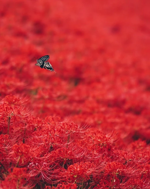 真っ赤な彼岸花の絨毯の上を、2匹の蝶が飛んでいる様子が非常に印象的。2匹の蝶がどんな関係性なのかを想像するのも楽しいですね。この一瞬を撮影するために何時間も粘ったそうです。