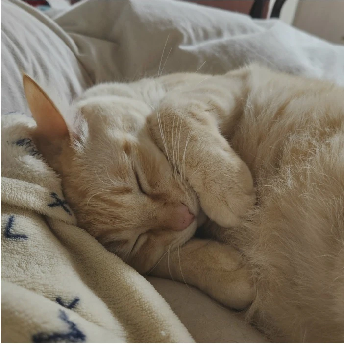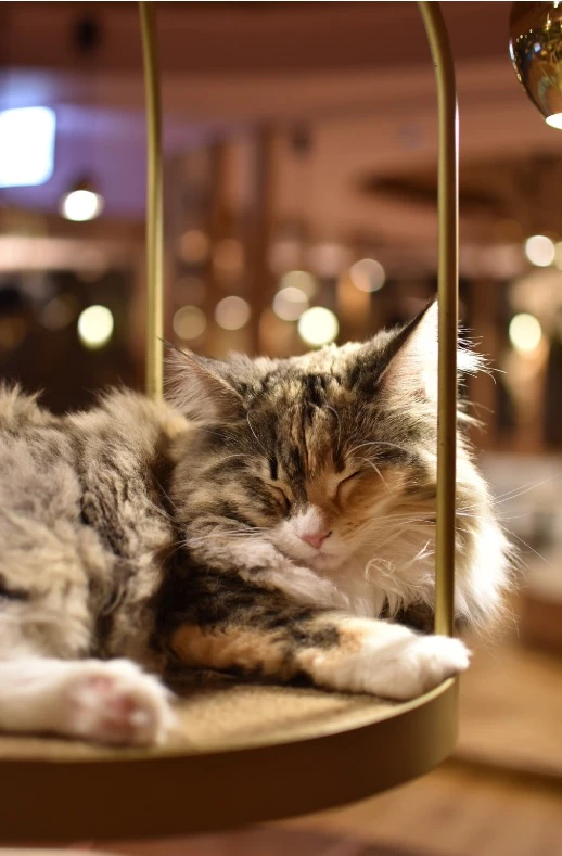 目を閉じた猫の愛おしさが伝わってくるとともに、背景の玉ボケが美しさを際立たせています。
