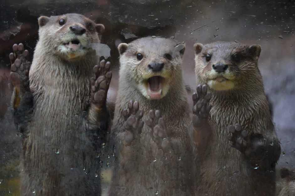 ガラス越しに餌をねだる3匹のコツメカワウソ。三者三様の表情をしているのが、なんとも面白いですね。この後無事に餌にありつけたのでしょうか…?