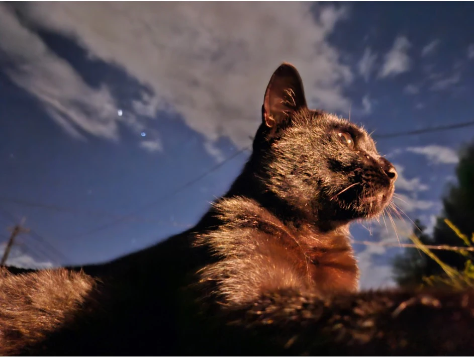 猫を下から仰ぐようなアングルで、星空と一緒に撮影しているのが印象的です。