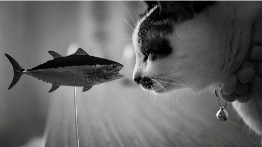 猫の大好物といえば魚。マグロの模型を眼の前に向けられた猫のなんとも言えない表情が表現されています。モノクロにすることで余計な情報が入らず、表情に集中できる作品のもポイントですね。