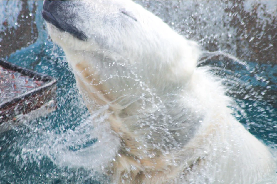 なかなかお目にかかれないホッキョクグマが、犬みたいにブルブルする貴重なシーンを捉えた一枚。目をつぶっている様子が気持ちよさそうにも見えますね。