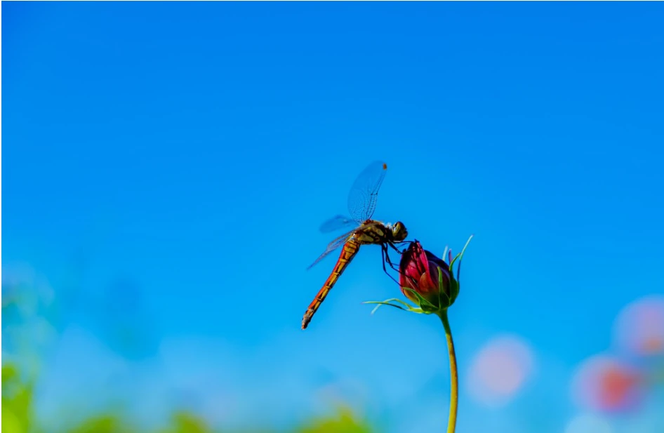 被写体となるトンボにバッチリとピントを合わせながら、背景に青空とボカしたコスモスを取り入れた作品。日本の秋を代表する要素が詰め込まれています。