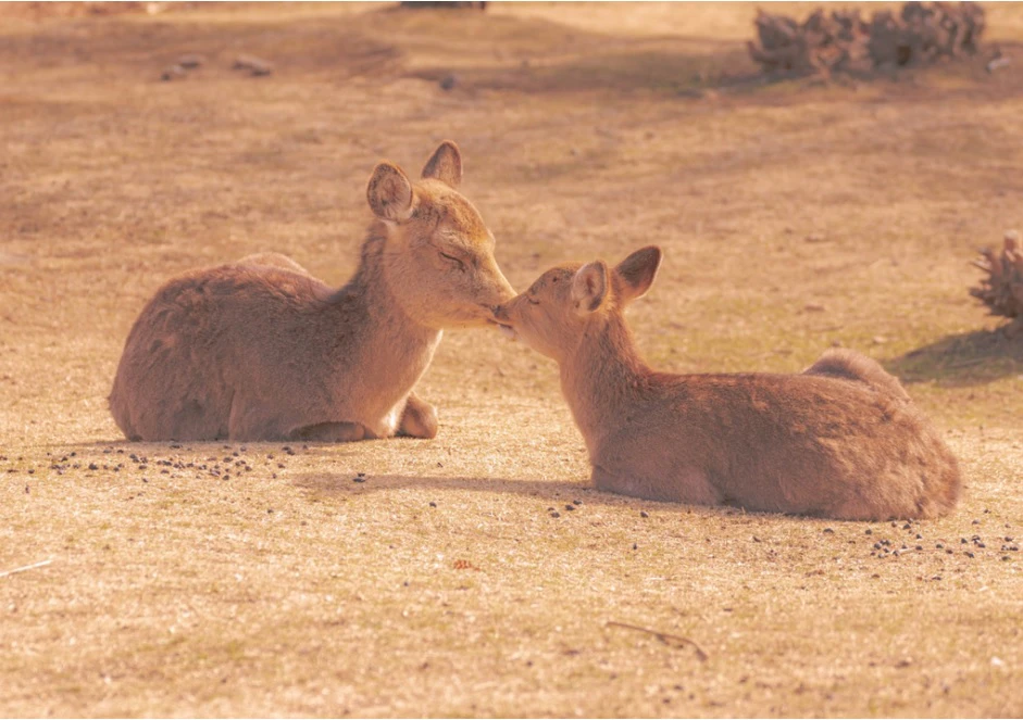 シカをたくさん見られる奈良公園で撮影していますが、こんな仲睦まじいシーンに出会うことはめったにないでしょう。まるでチュッとしているかのようなアングルに見とれてしまいます。
