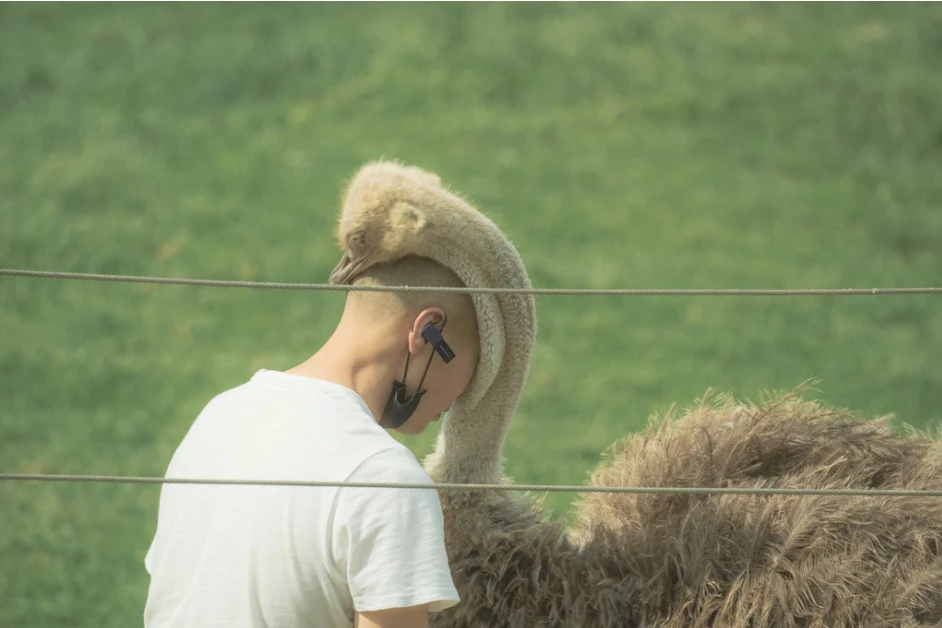 動物園のダチョウと飼育員さんのワンシーンを撮影したものですが、見た瞬間に確かに「なんだこれ?」と言ってしまう写真です。ツルツルの頭を抱いたダチョウがなんとも気持ちよさそうな表情をしているのもポイントですね。