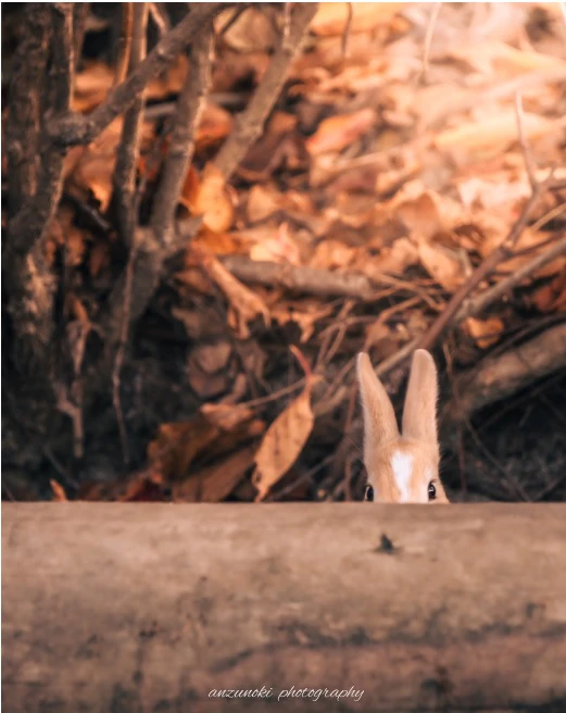 可愛らしい耳をピンっと立てて、こちらを伺っている様子が非常に可愛らしいですね。背景に落ち葉を入れることで季節感がよくわかる点もポイントです。
