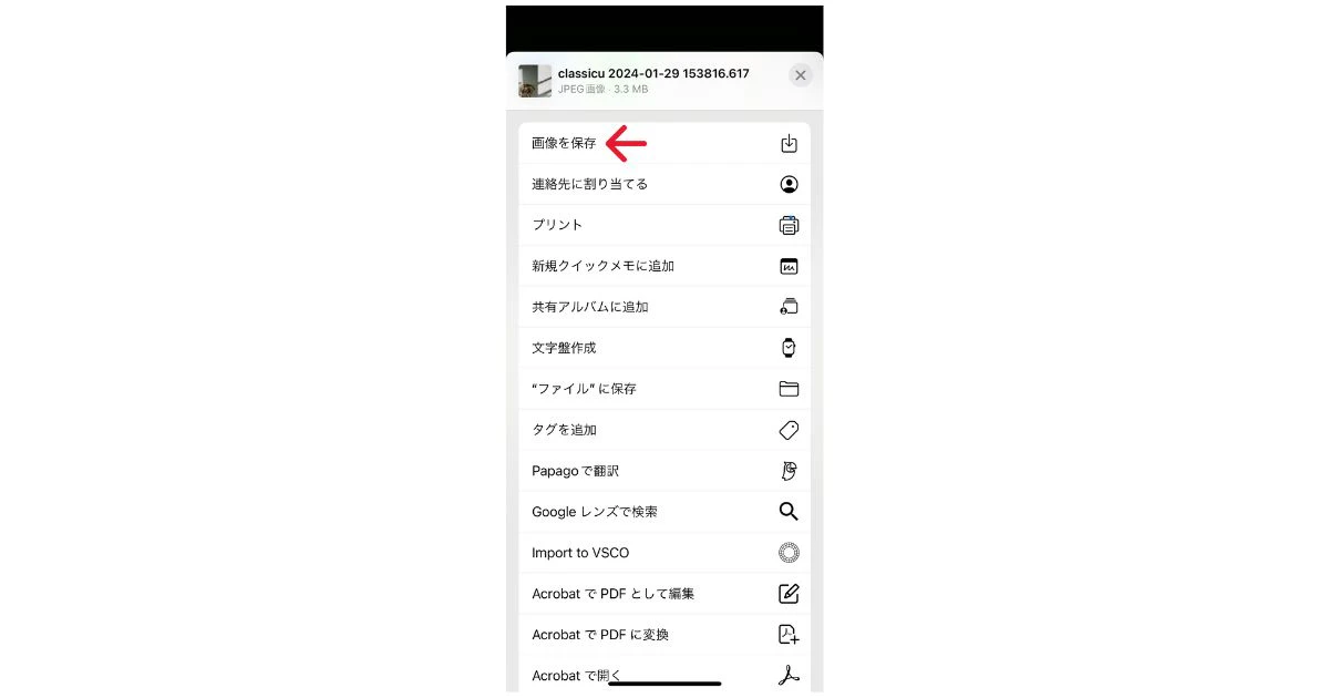 左下の保存マークをタップして、「画像を保存」を押すとカメラロールに写真を保存できます。