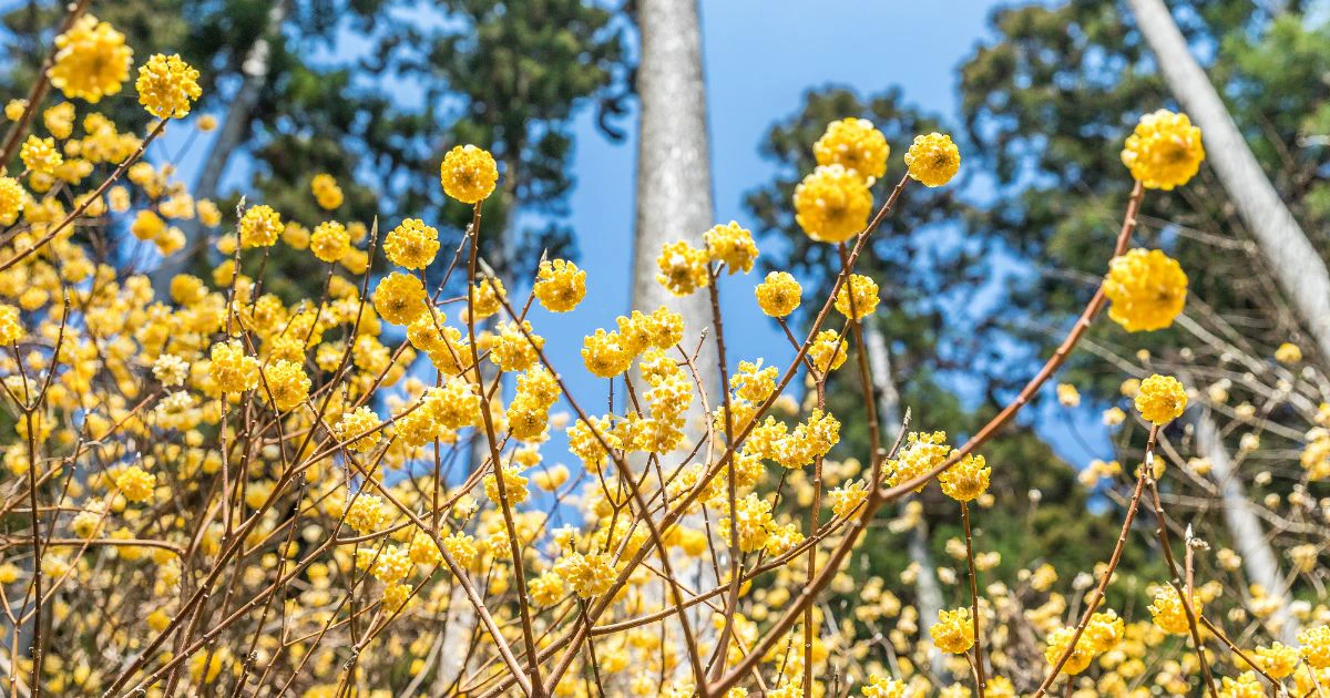 春の被写体として注目されているミツマタ。1m〜2mほどの低木で、3月中旬頃からボンボンのような黄色い花を咲かせ、4月上旬に見頃を迎えます。山の中で見られることが多く、辺り一面に広がる可愛らしい黄色の絨毯は絶景です。