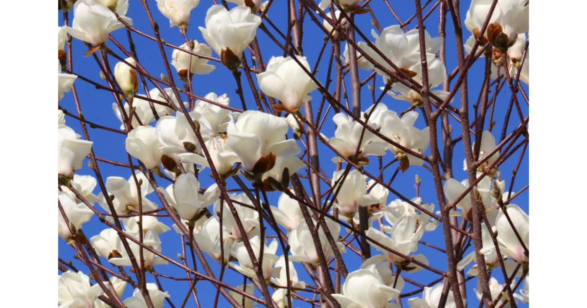 紫紅色の花が上向きに咲く木蓮。写真は白木蓮という白い木蓮です。他の花々とは咲き方が少し異なりますが、4月に開花する低木に咲く花です。咲き方等が他の春の花と異なる点も、レア感があり、春の被写体としておすすめです。