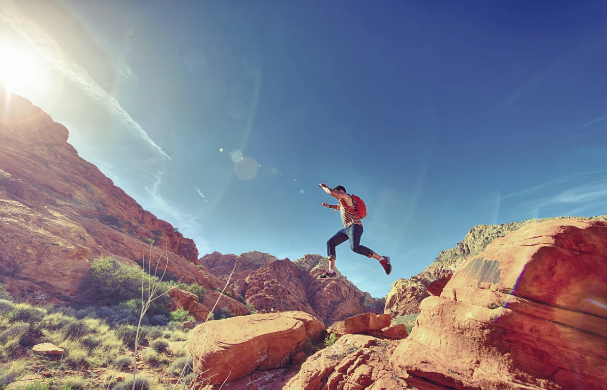 遠くへジャンプして、足を前後に大きく広げてみましょう。ポイントは、「遠くへジャンプ」を意識することです。上にジャンプするのもいいですが、かっこよさよりも楽しそうな印象を受けます。被写体よりも低い位置から撮影すると躍動感が出て、かっこいい一枚が出来上がります。