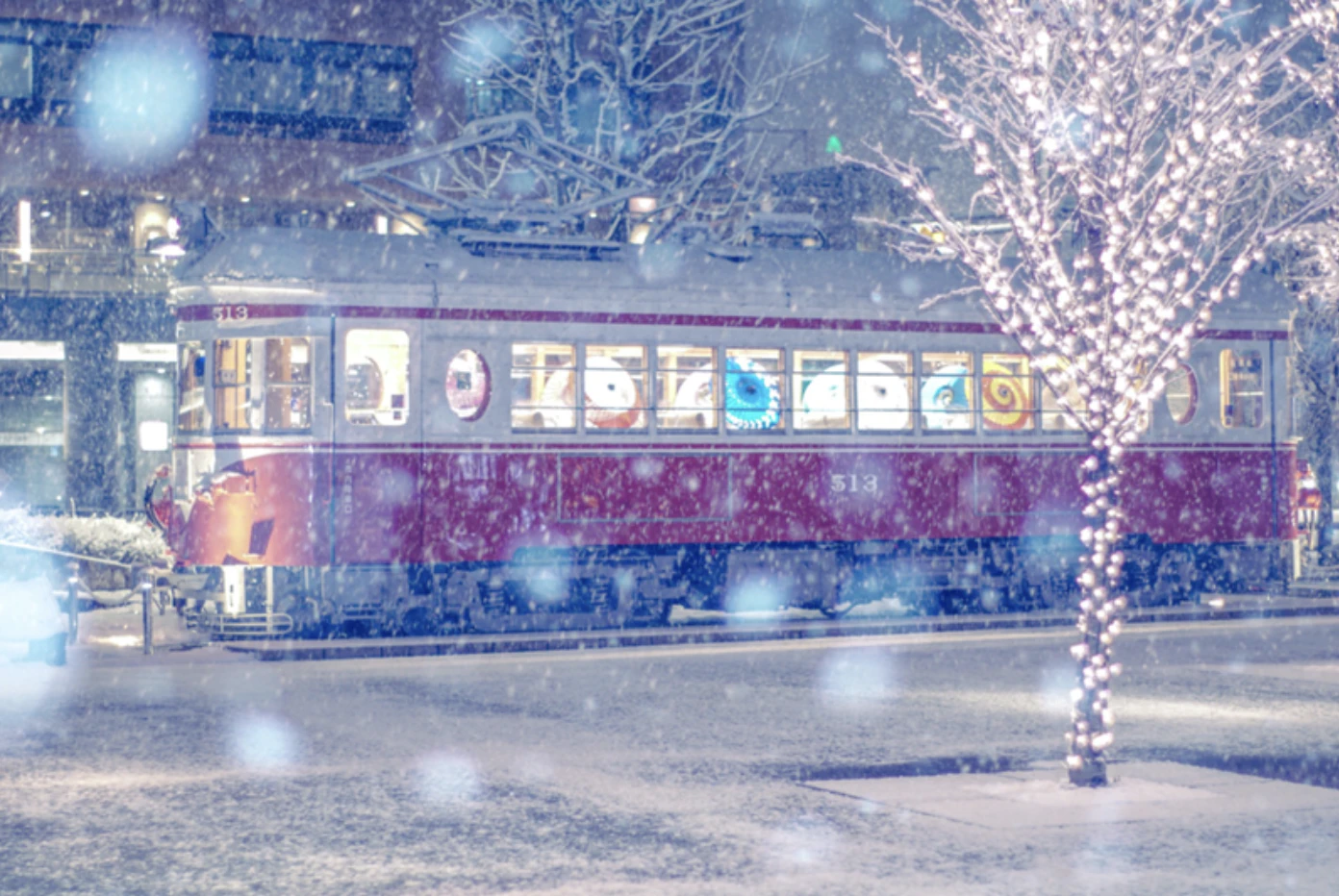 大粒の雪がしんしんと降っていますが、イルミネーションと電車内の光が温かみを感じさせます。