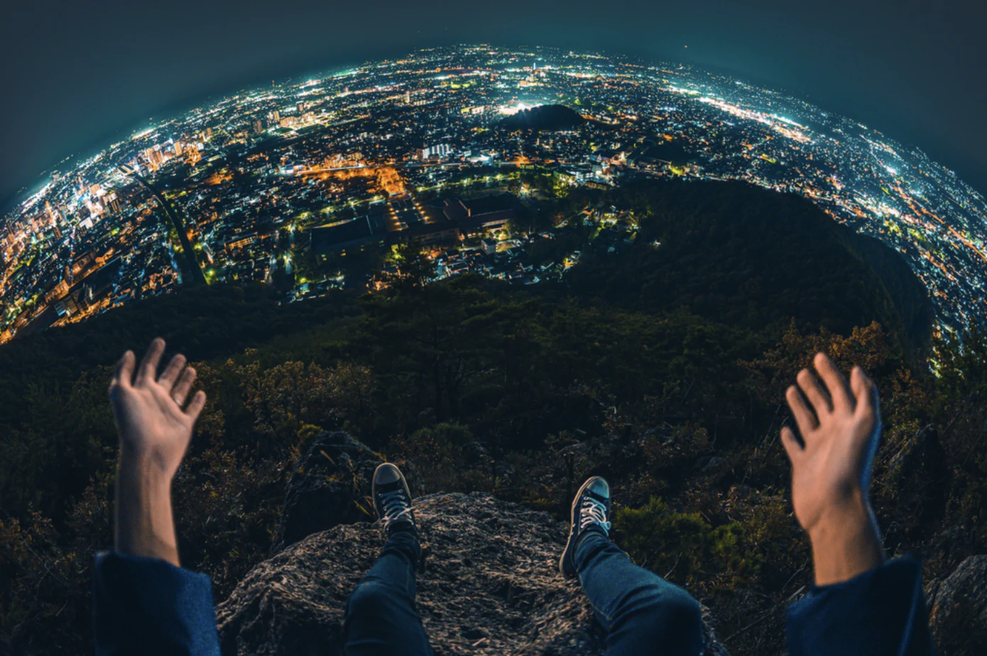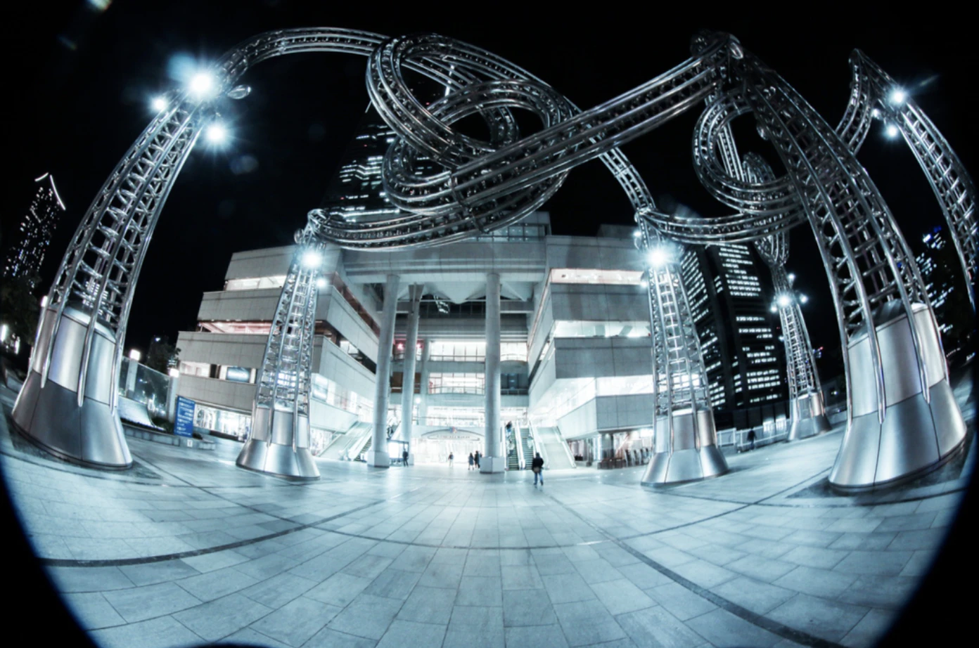 まっすぐに映るはずのビルが立ち並ぶ夜景が丸くドーム状に写っています。ただ夜景を撮影するよりも、臨場感のあるダイナミックな一枚ですね。