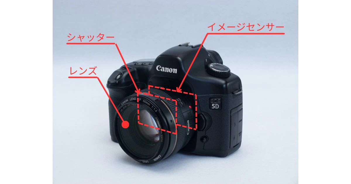 カメラの主要部品には、レンズ、イメージセンサー、シャッターがあります。