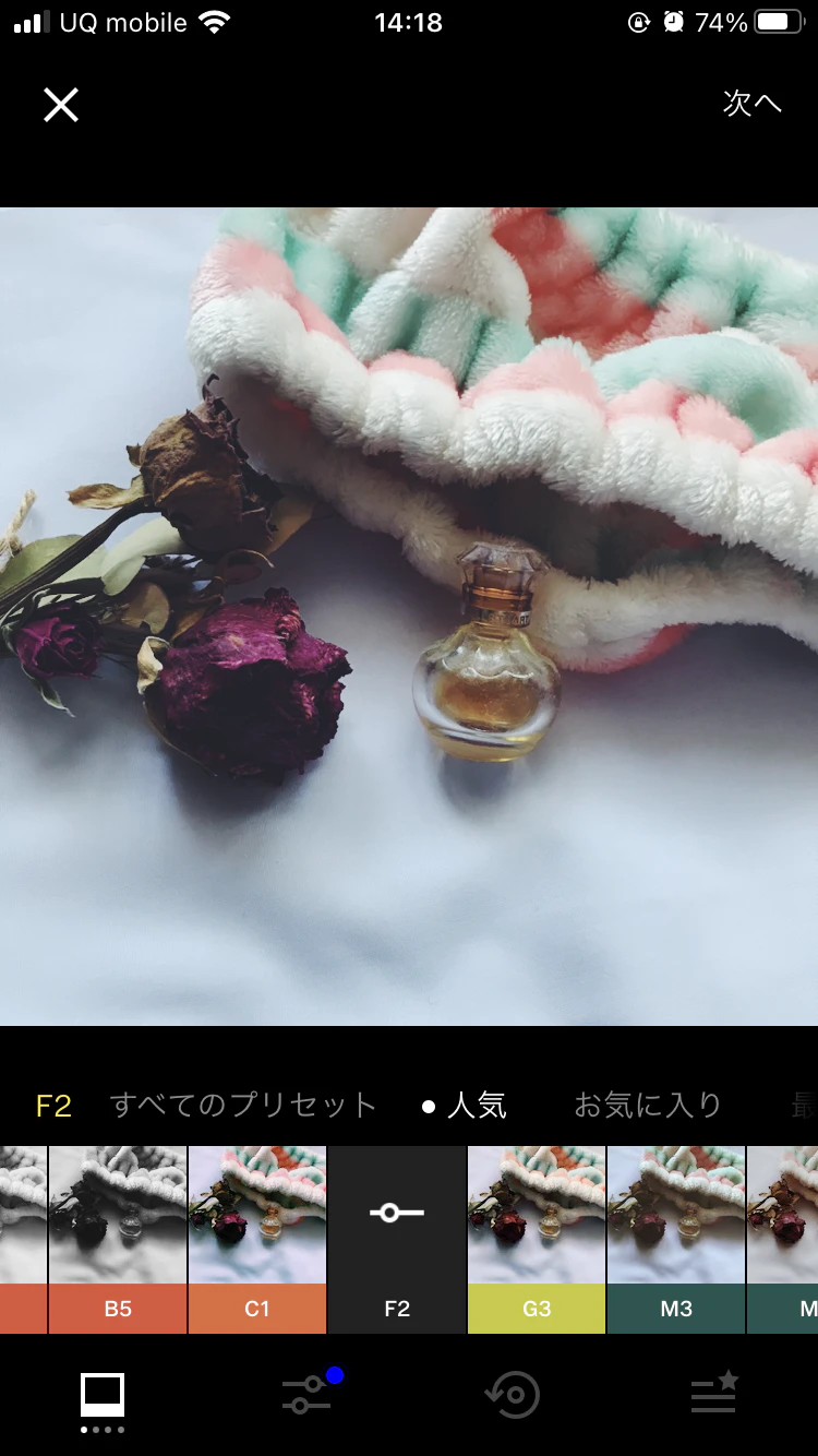 自分の好みの編集を1度見つけて保存しておけば、次からワンタッチで再現可能です。