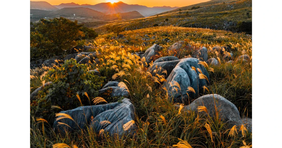 平尾台の日が傾く秋の風景写真です。まず、夕陽に照らされたススキの黄色またはオレンジ色、草原の緑、岩の青白さのコントラストが非常に素敵な写真です。夕日で照らされた暖色だけでなく、敢えて平尾台の岩の寒色を近距離に配置することで、秋らしい暖かさと寒さの同時表現がなされています。中心付近に秋の七草であるススキを配置することでより一層秋らしさを認識することができる素晴らしい作品です。