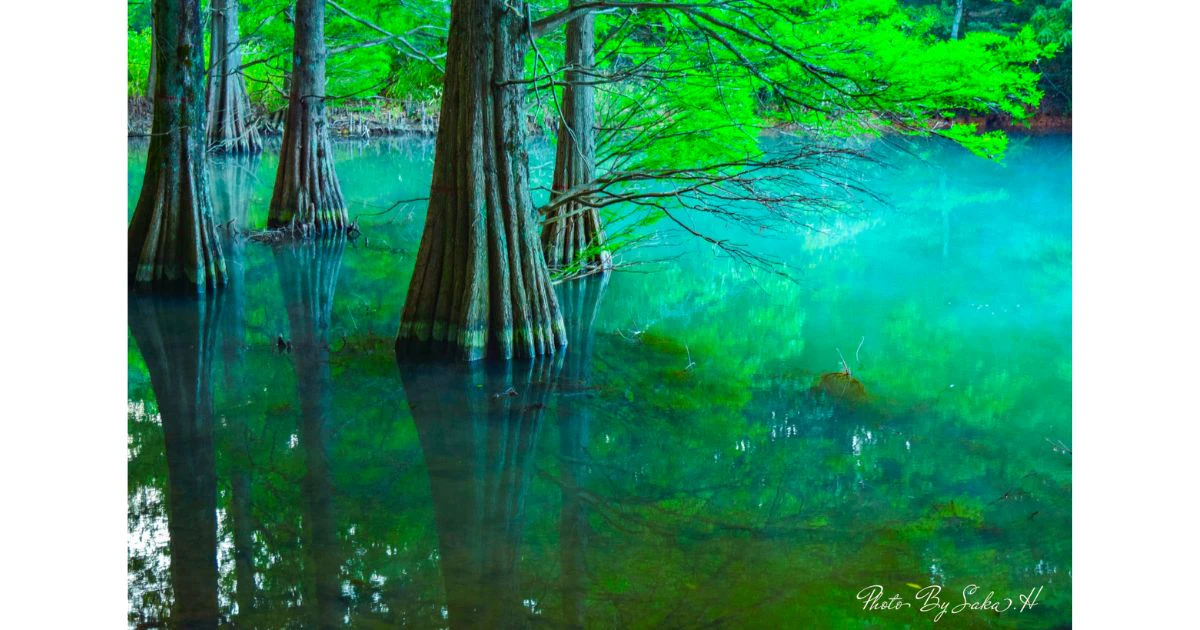 水辺を散歩できる場所として知られている篠栗九大の森ですが、この写真ではその水辺と木々を捉えています。この写真はおそらく撮影後にコントラストを濃くするように編集されていますが、この編集で木々の緑と水辺の反射が際立った美しい作品となっています。