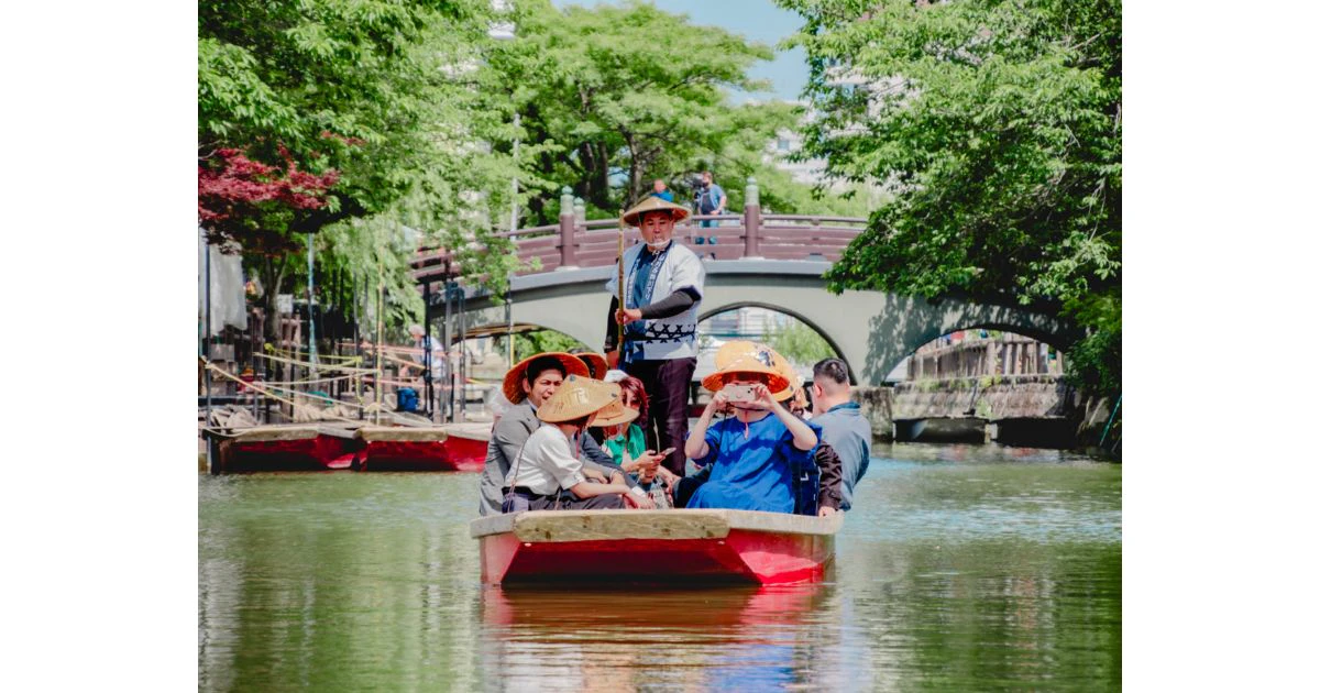 柳氏の観光スポット、柳川川下りの際の写真です。撮影者は船で観光しているわけではなく、船に乗った観光者と船頭さんを撮っています。船に乗った左の方の笑顔や、こちら側にスマホを向け撮影をしようとする方が見られ、川下りの観光の楽しさを表しています。