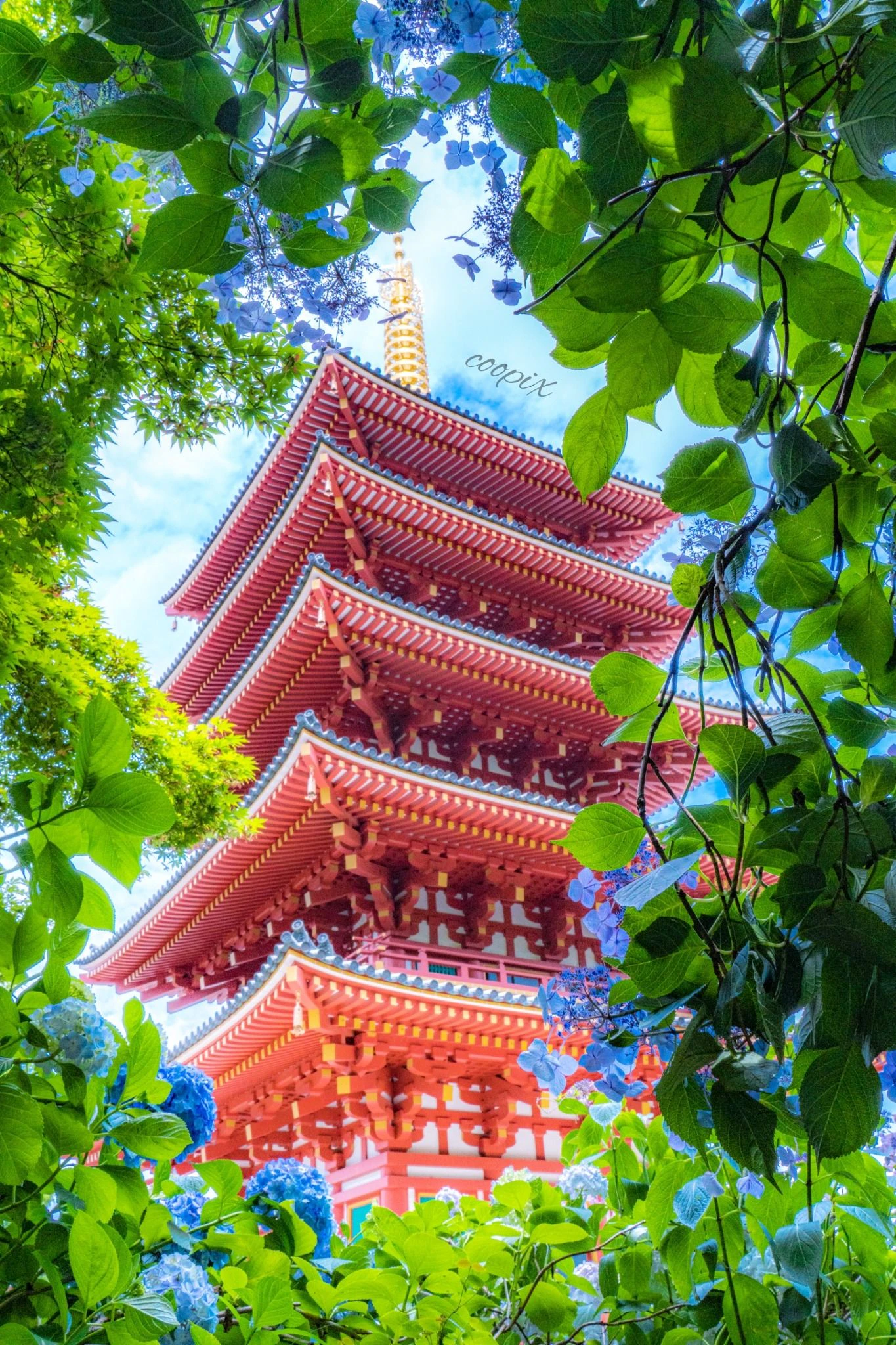 朱色の塔に対して、緑の葉っぱと鮮やかに咲いた紫陽花の対比がとても美しいです。