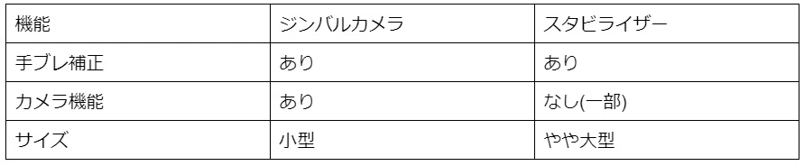 「ジンバルカメラ」と「スタビライザー」は手ブレを抑える点では基本的に同じものです。