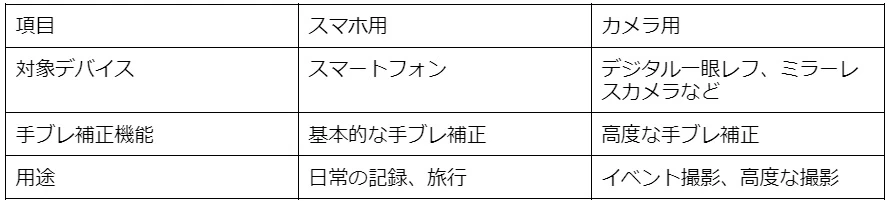 一方、カメラ用はデジタル一眼レフカメラやミラーレスカメラに搭載するため、スマホ用に比べると大型で、ハイクオリティな動画撮影をしたい方向けです。
