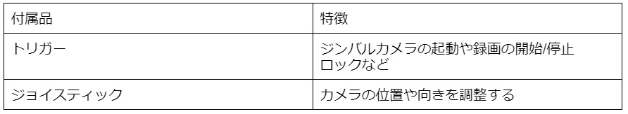 ジンバルカメラには、いくつかの付属品が用意されています。トリガーやジョイスティックは動画撮影をスムーズに行うための付属品です。