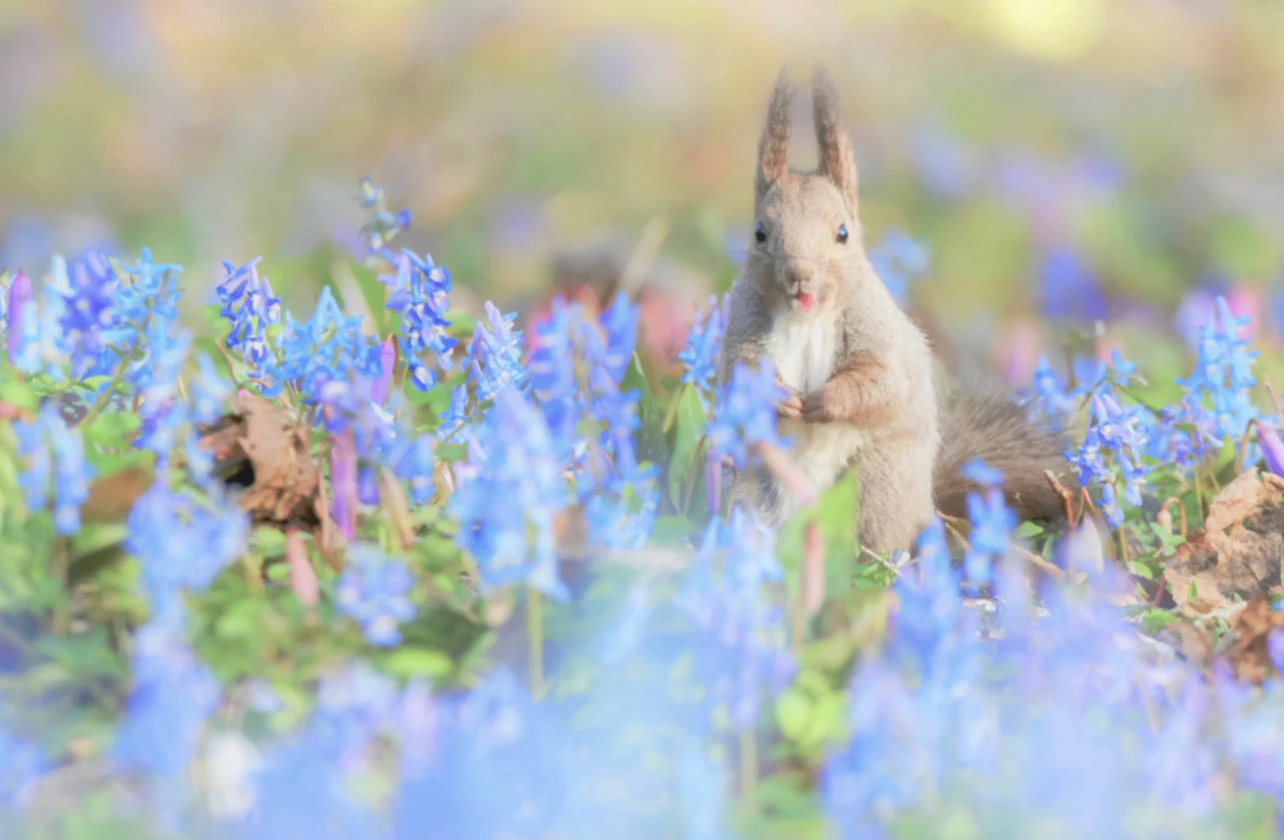 まるで絵本の世界!カメラ目線のエゾリスがとてもかわいいです!また、ふんわり感がある写真で癒されますね。