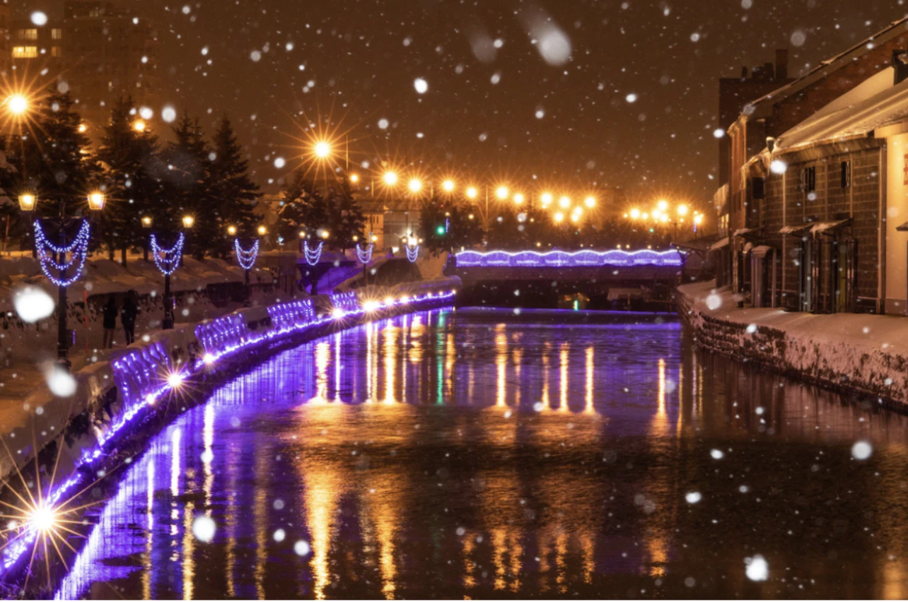 雪とイルミネーションのコラボ。雪が降る冬の時期にしか味わえない贅沢な光景ですね。また、運河に映る光も良いですね。