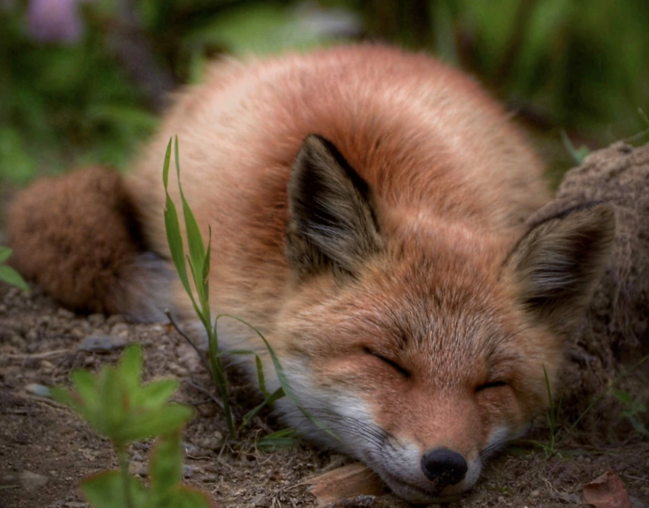 ぐっすりお昼寝中のキタキツネ。警戒してなさそうですが、ばっちり警戒しているそうです。キタキツネの寝顔が撮られた貴重な一枚ではないでしょうか。