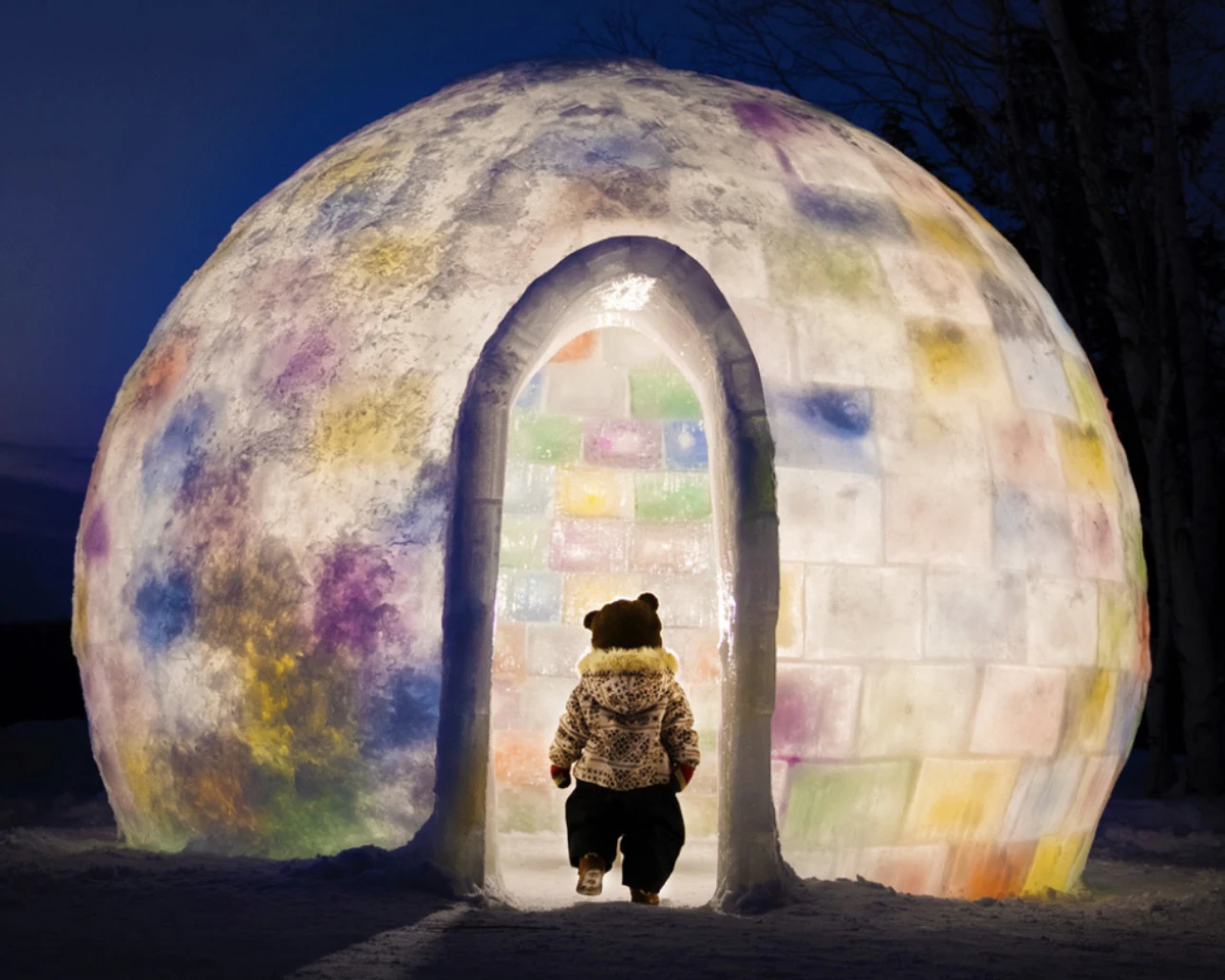 カラフルな氷のブロックをひとつひとつ積み上げて作られたアイスボール。約20名ほどが入れる大きさです。夜空の下でカラフルに輝くアイスボールが幻想的でもありかわいいですね。