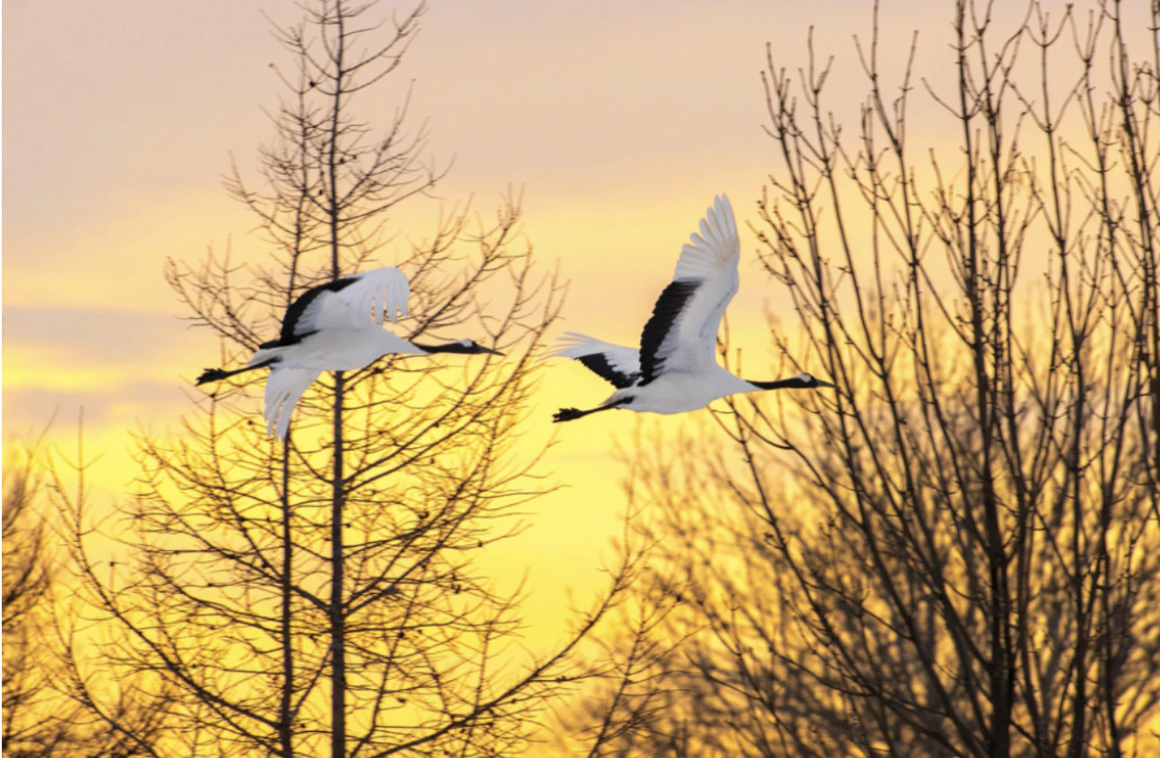 2羽の仲良し丹頂鶴が、綺麗な夕焼けの中を飛んでいる姿はとても印象的です。夫婦なのでしょうか?それともお友達でしょうか?どちらにしても微笑ましいですね。