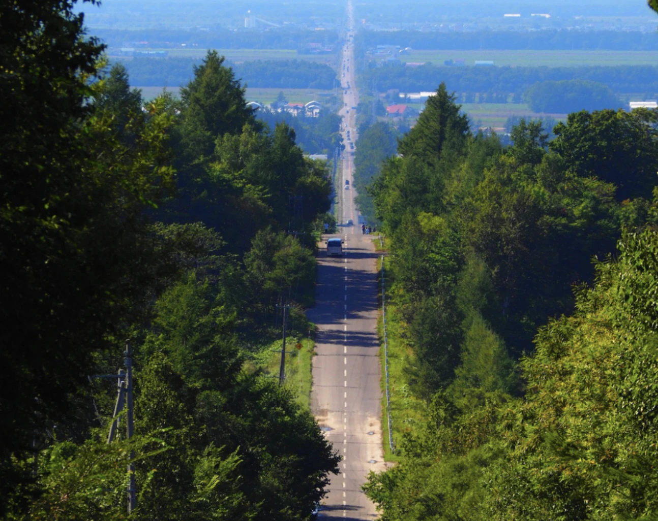 果てしなく真っ直ぐ続いていく道が本当に天まで続いているようです。自然豊かな緑の風景がより一層天に続く道を引き立ててますね。