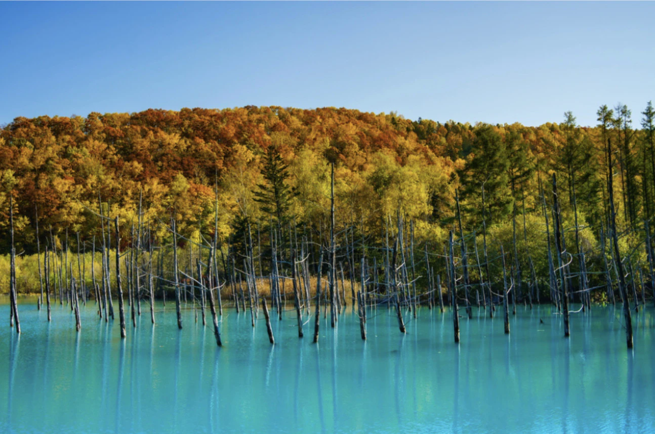 北海道の観光名所のひとつ「青い池」。赤・青・黄の映え写真ですね。コバルトブルーの池がとても神秘的で、まるで異世界にきたかのような気持ちにさせてくれます。こちらの写真は、紅葉の時期に撮られたものですが、季節によって異なる表情が見られます。