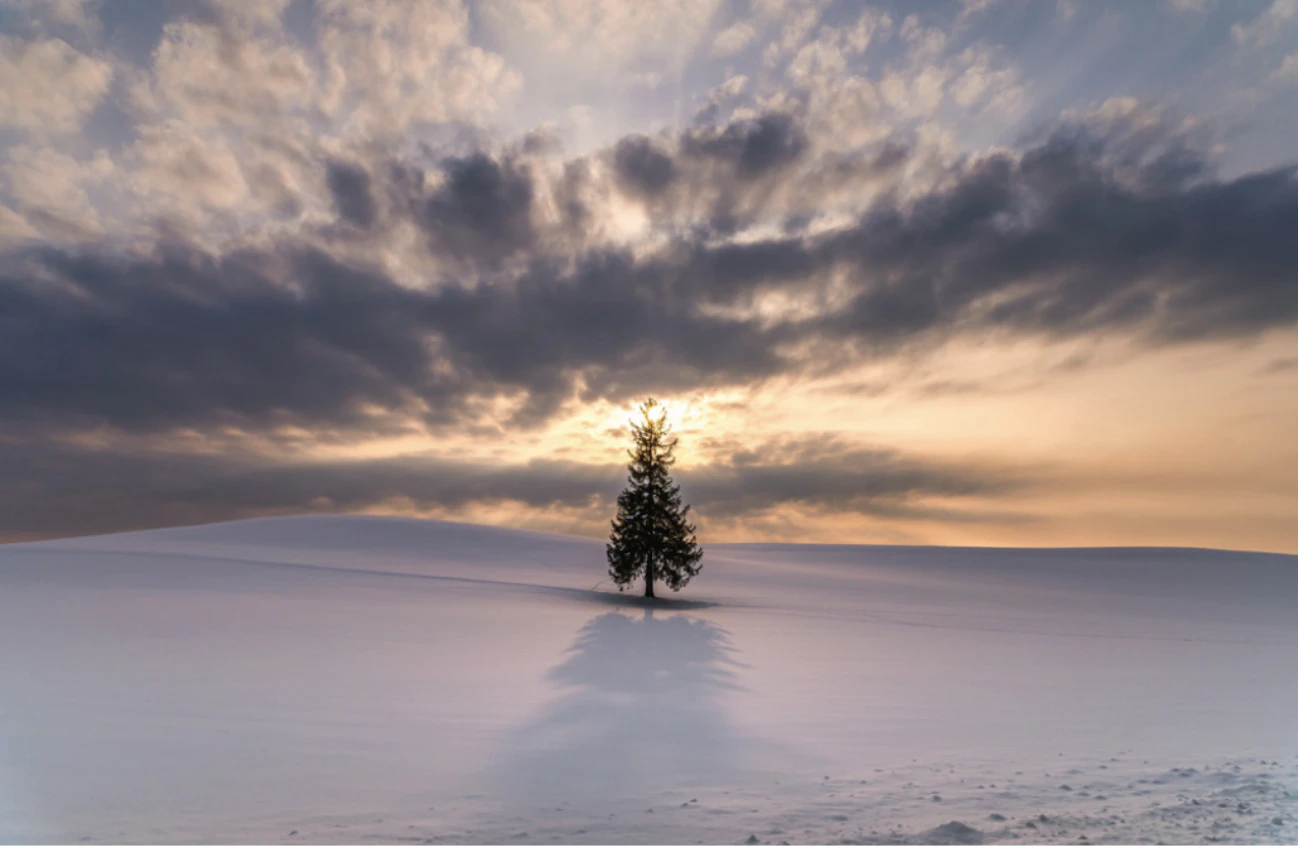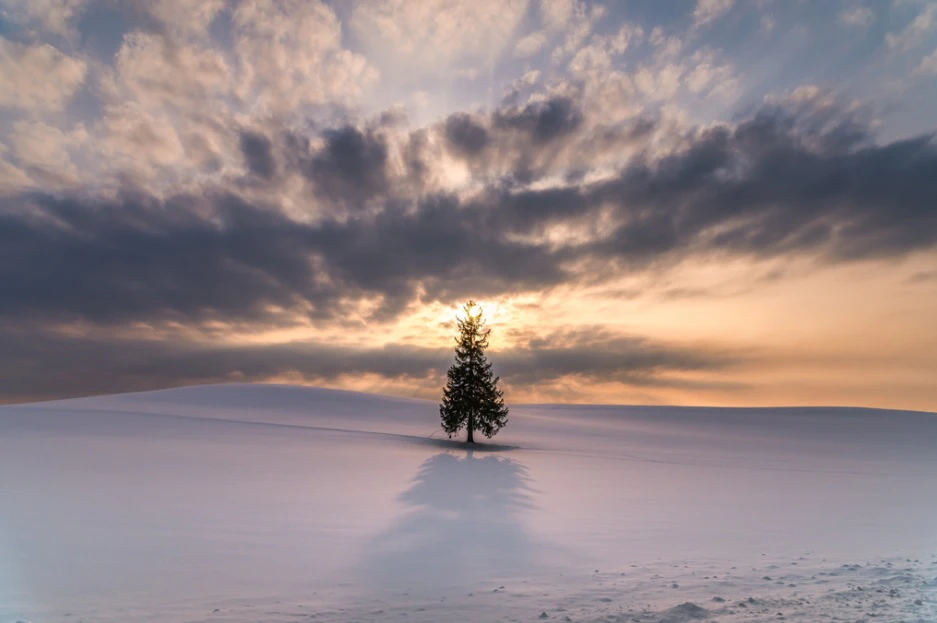 美瑛町にある「クリスマスツリーの木」。円錐形でクリスマスツリーに似ていること等から由来しています。真っ白い雪の中にたたずむ木に、夕暮れの光がとても幻想的で奥深さが感じられます。また、木のてっぺんに光があたり、本当のクリスマスツリーのように見えますね。