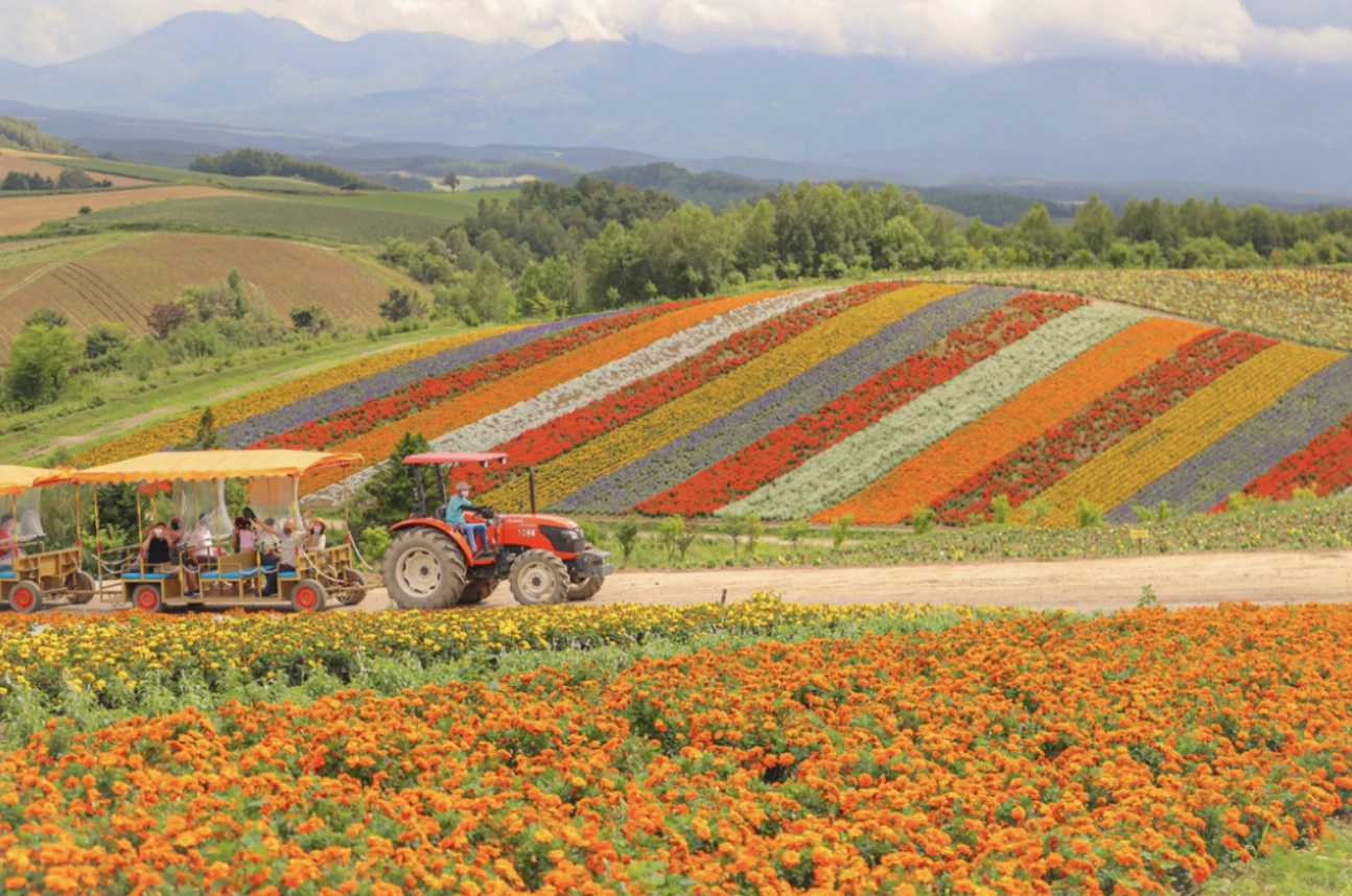 赤や黄色、青、オレンジなどの花々がとても綺麗ですね!虹色のカーペットのようです。トラクターも写っていて、のどかでほっこりするような写真ですね。7月上旬には約20種類以上の花が同時に咲き、お花好きの方にピッタリの撮影スポットです。