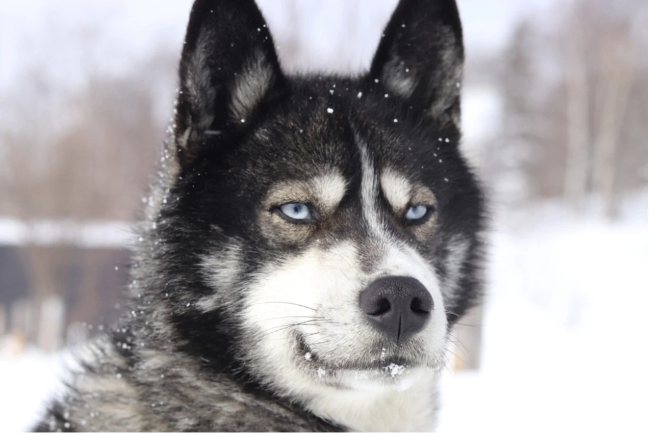 犬ぞり体験ができるスポットで撮影された一枚です。ブルーの瞳が綺麗なハスキー犬。力強さも感じられる一枚です。また、雪が良いアクセントになってますね。