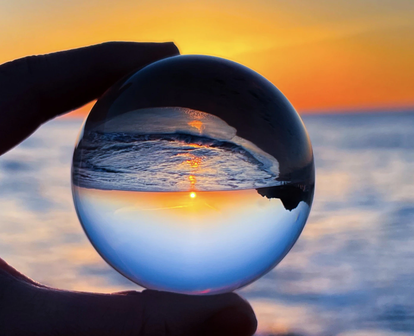 カメラの前にクリスタルボールをかざすだけで、風景が上下左右、反転した写真が撮れます。目の前に広がる景色が小さなクリスタルボールの中に閉じ込められた感じが面白く、幻想的でもあります。